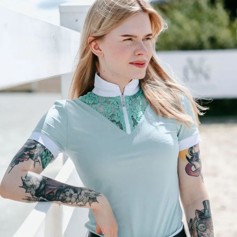 The Viki Show Shirt is the perfect blend of modern sport performance and timeless elegance. Designed for the rider who wants to feel confident and comfortable in the ring, this competition shirt features luxurious Italian lace, delicate crystals, and premium technical fabrics that feel like a second skin.